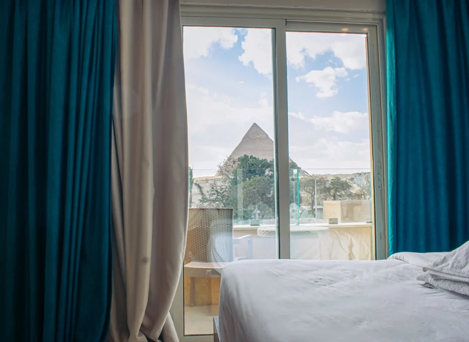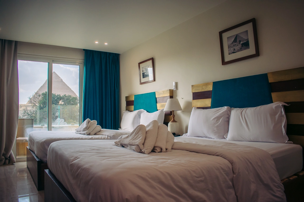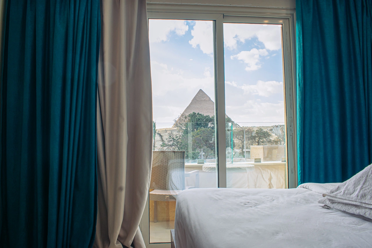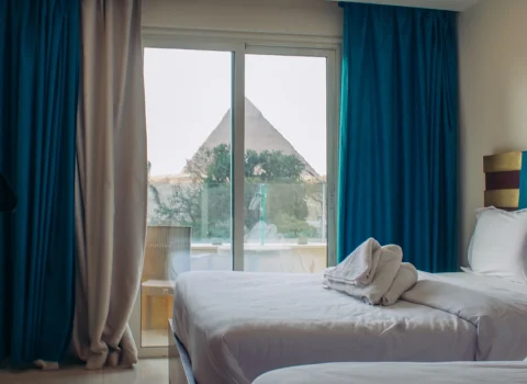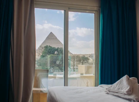 Perfect for families or groups, our Quadruple Room offers spacious comfort and a private balcony with breathtaking views of the Pyramids of Giza. Featuring two king-size beds, and sofa a welcoming atmosphere, and all the essentials for a relaxing stay, it’s the ideal choice for sharing memorable moments. Enjoy the magical pyramid view as you relax on the balcony, morning or evening.